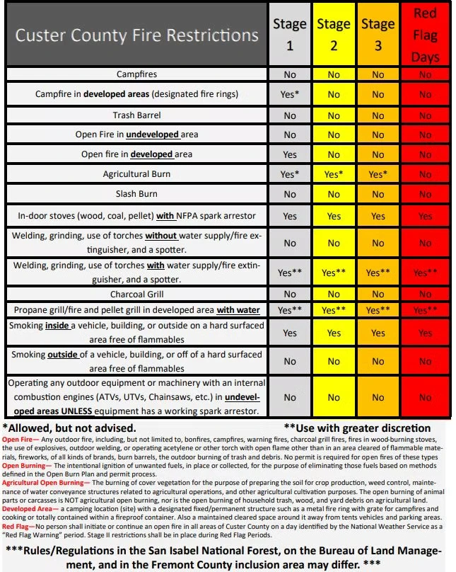 Current fire restrictions, open burn permits, ordinances, and wildfire prevention information for Custer County residents and visitors.